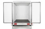 Pour faciliter le chargement, la paroi arrière peut être ouverte et une bâche plate peut être fixée pour protéger les produits transportés.
